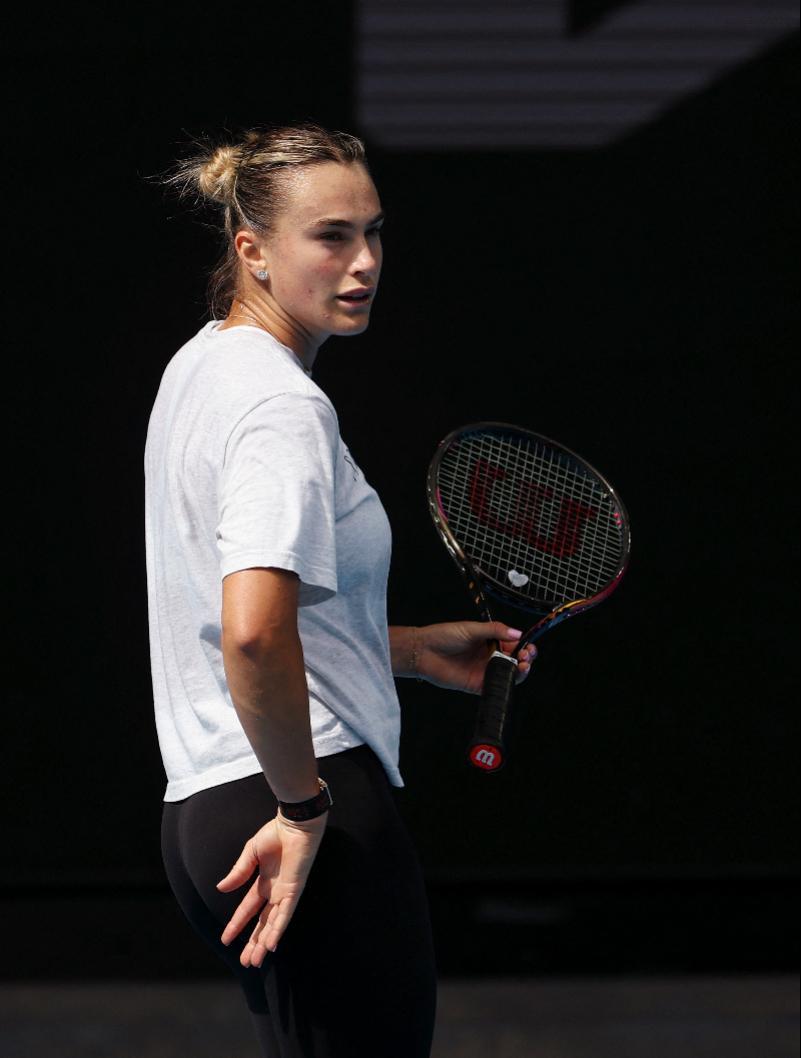 1月15日,在澳大利亚墨尔本,白俄罗斯选手萨巴伦卡进行赛前训练。新华社发